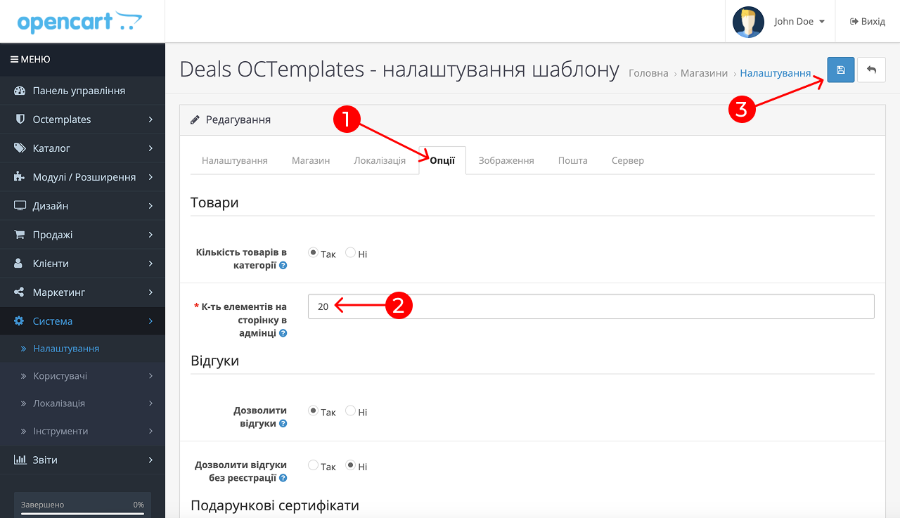 Спочатку ви можете видаляти по 20 товарів з адміністративної частини опенкарт, при великій кількості товару це трудомісткий і витратний процес. Але, ми можемо змінити ліміт виведення товарів на сторінку з 20 наприклад у 100 або навіть 500 товарів, тоді ви зможете видалити набагато більшу кількість товару за один раз.